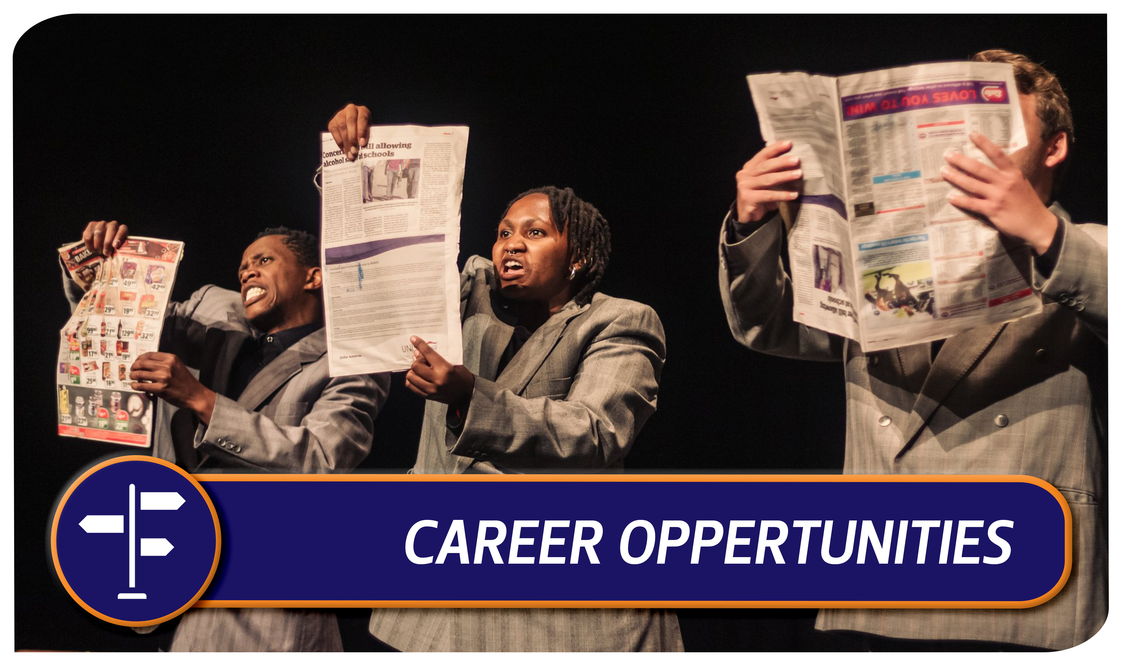 Our programme will prepare you for a career in the broad entertainment industry, including the professional stage, industrial theatre, television and film industries, as actor, theatre-maker, dramatist, director or producer, stage manager, lighting designer, lighting operator, sound operator, décor and costume designer, make-up artist, theatre management and arts management. Other avenues include marketing, events management, radio and voice work even motivational speaking. The possibilities are endless.