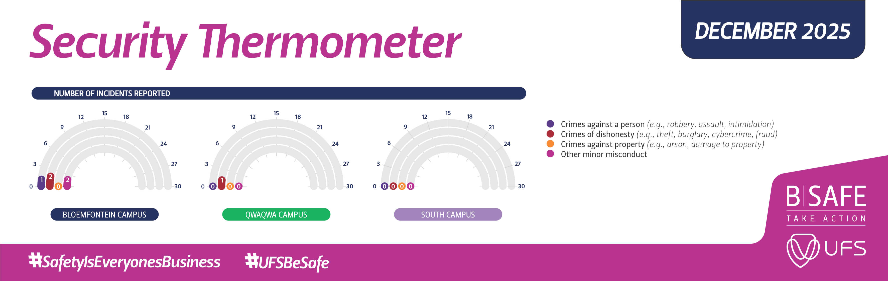 From 24/7 security patrols and surveillance systems to emergency response and support services, we strive to provide a secure and welcoming environment for everyone. We encourage all members of the UFS community to actively participate in maintaining safety – both on and off campus – by adhering to our security policies and reporting any suspicious activities.