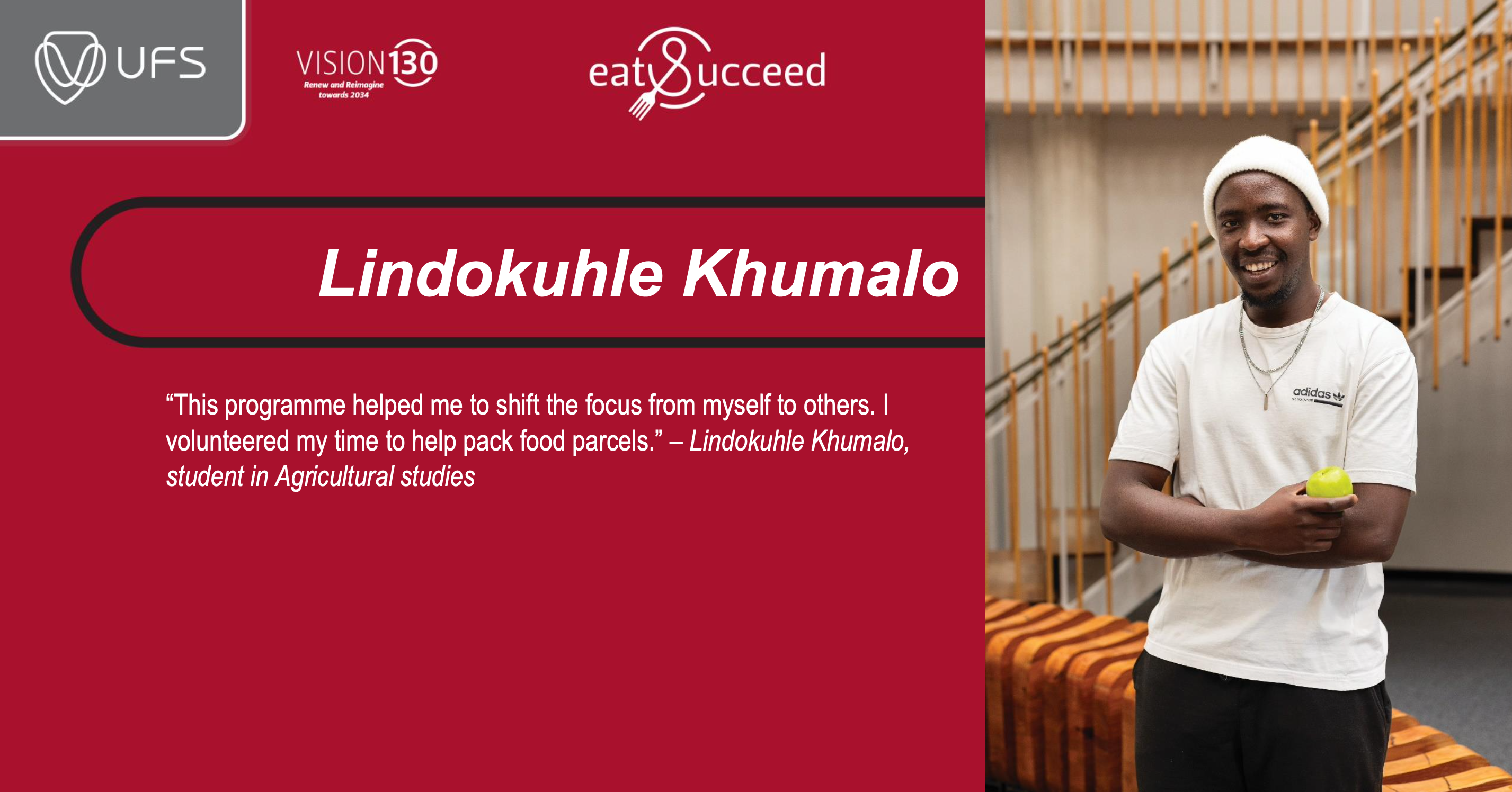 Lindokuhle Khumalo, a student in Agriculture studies, shares how the programme inspired him to shift his focus from personal goals to volunteering and packing food parcels for others.