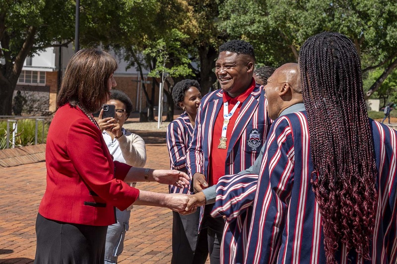 The University of the Free State men’s football team with Prof Hester C. Klopper, UFS Vice-Chancellor and Principal (in red jacket); Mokete Tsotetsi, Head Coach (right of Prof Klopper); and Dr Temba Hlasho, Executive Director: Student Affairs (right of Coach Tsotetsi), following their historic Varsity Football victory.